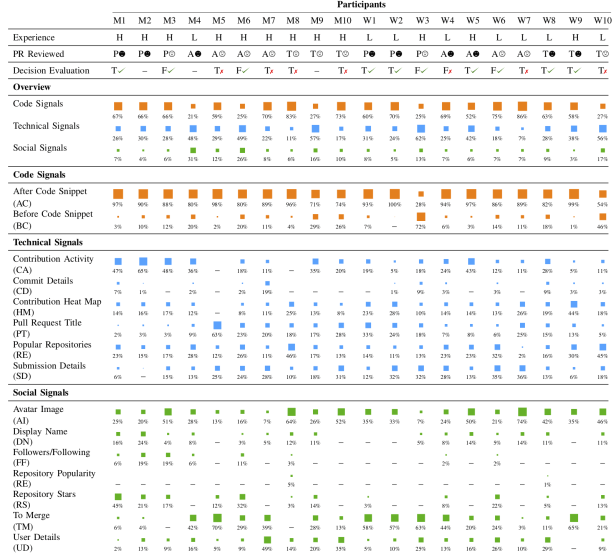 For RQ2, we find that programmers review more social signals than reported. As the ranged dot plot below shows, we compared the AOIs they fixated upon and the areas they reported reviewing in the post-survey. One particularly interesting result to point out here is that only 1 developer reported using the submitter’s avatar image(labeled AI in the figure), however, all participants reviewed that element of the profile.